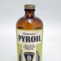 Pyroil glass bottle with a paper label. Bottle is brown with a metal screw on top. Label is green and white with black text "Genuine Pyroil Heat-Proof Lubrication Process Crank Case Oil B." |
